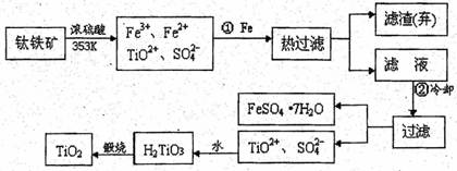 (9分)自潔面料就是在普通的面料纖維中加入一層薄薄的納米二氧化鈦。含有Fe2O3的鈦鐵礦(主要成分為FeTiO3,Ti的最高價(jià)為+4)制取納米級(jí)TiO2的流程如下:![]()