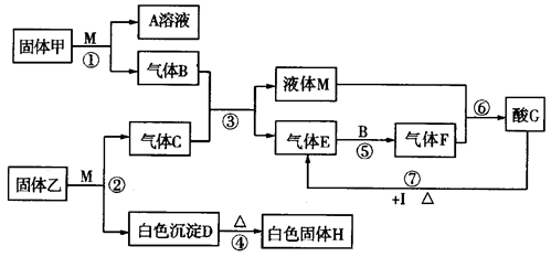 .(12分)在下圖轉(zhuǎn)化關(guān)系中,固體甲的焰色反應(yīng)呈黃色,M為常見的液體物質(zhì),I為常見金屬,且I與G的稀溶液不反應(yīng),只能與G的濃溶液在加熱條件下反應(yīng);酸G是重要的化工產(chǎn)品和化工原料;H為良好的耐火材料(圖中部分產(chǎn)物沒有列出)。![]()