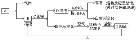 (10分)已知常見金屬單質(zhì)A有以下物質(zhì)相互轉(zhuǎn)化![]()