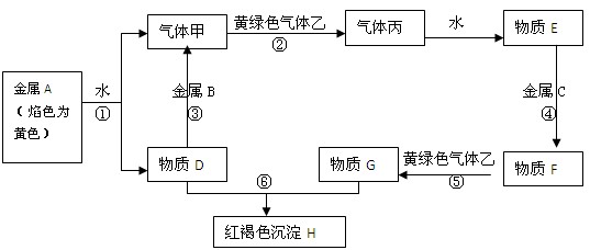 (10分)現有金屬單質A、B、C和氣體甲、乙、丙及物質D、E、F、G、H,它們之間能發(fā)生如下反應(圖中有些反應的產物和反應的條件沒有全部標出)。![]()