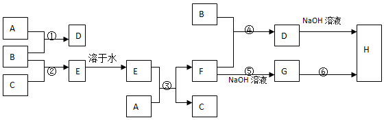 (10分)室溫下,單質(zhì)A、B、C分別為固體、黃綠色氣體、無色氣體,在合適的反應(yīng)條件下,它們按圖進(jìn)行反應(yīng)。又知E溶液是無色的,H是紅褐色難溶物。請回答:![]()