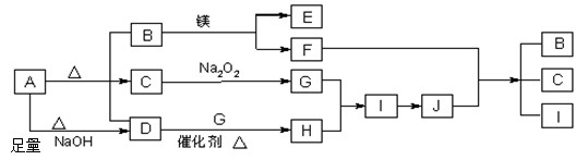 (15分)下圖中A~J分別代表相關反應中的一種物質(zhì),已知A分解得到等物質(zhì)的量的B、C、D,已知B、D為常溫下氣態(tài)化合物,C為常溫下液態(tài)化合物,圖中有部分生成物未標出。![]()