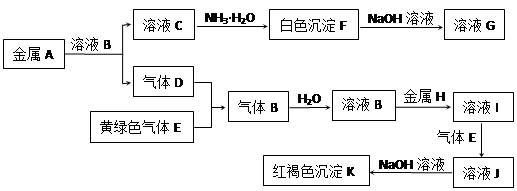 物質(zhì)A、B、C、D、E、F、G、H、I、J、K有下圖轉(zhuǎn)化關(guān)系,其中氣體D、E為單質(zhì),![]()