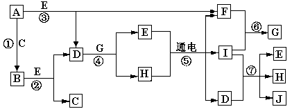 (15分)物質(zhì)A、E、F的焰色反應(yīng)呈黃色,物質(zhì)I的1個分子由4個原子組成并共含有10個電子,B、C、D、K在常溫下都是氣體單質(zhì),G在常溫下是無色液體,反應(yīng)①~⑤都是用于工業(yè)生產(chǎn)的反應(yīng),各有關(guān)物質(zhì)之間的相互反應(yīng)轉(zhuǎn)化關(guān)系如下圖所示(部分反應(yīng)條件已略去):![]()