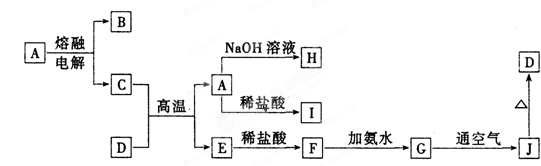 (8分)A是一種紅棕色金屬氧化物,B、D是金屬單質(zhì),J是一種難溶于水的白色化合物,受熱后容易發(fā)生分解.![]()