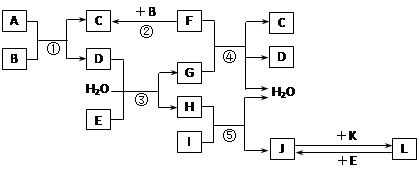 (10分)下圖為中學化學中幾種常見物質的轉化關系(部分產(chǎn)物已略去)。已知:A、D是金屬單質,L為紅褐色沉淀,E為食鹽的主要成分,I的水溶液呈強酸性。![]()