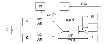 (13分)甲、乙、丙為短周期常見的單質,乙、丙兩元素的原子序數(shù)相差8。X、A、B、C、D、E、F、G均為常見的化合物,其中A、G的焰色反應為黃色,A和X的摩爾質量相同。在一定條件下,各物質相互轉化關系如下圖。![]()
