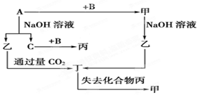 由短周期元素組成的單質(zhì)A、B、C和甲、乙、丙、丁四種化合物有下圖所示的轉(zhuǎn)換關(guān)系,已知C為密度最小的氣體。![]()