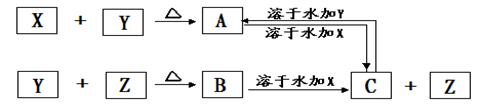 (7分)X、Y、Z為三種單質(zhì),常溫下X為金屬,Y是液體,Z是無色氣體。其反應(yīng)關(guān)系如下圖所示,其中B的溶液顯強(qiáng)酸性。請(qǐng)回答下列問題:![]()