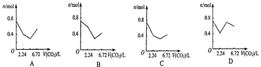 向含有0.2 mol氫氧化鈉和0.1 mol氫氧化鈣的溶液中,持續(xù)穩(wěn)定地通入二氧化碳?xì)怏w,通入氣體為6.72 L(標(biāo)準(zhǔn)狀況)時,立即停止,則這一過程中,溶液中離子數(shù)目與通入二氧化碳?xì)怏w體積的關(guān)系正確的是(不考慮氣體的溶解)![]()