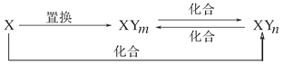 元素X的單質(zhì)及X與Y形成的化合物能按如圖所示的關(guān)系發(fā)生轉(zhuǎn)化(其中m≠n,且均為正整數(shù))。下列說法正確的是( )![]()