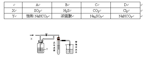 向下圖裝置中緩慢地通入氣體X,若關(guān)閉活塞,則品紅溶液無變化,而澄清石灰水變渾濁;若打開活塞,則品紅溶液退色,加熱后又恢復紅色。據(jù)此判斷氣體X和洗氣瓶內(nèi)溶液Y分別可能是 ( )![]()