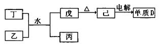 ①丁與乙和水反應(yīng)生成戊和丙的離子方程式為 ,由物質(zhì)己電解得到單質(zhì)D的化學(xué)方程式為 ;