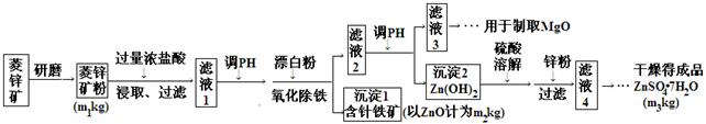 (14分)硫酸鋅可作為食品鋅強化劑的原料。工業(yè)上常用菱鋅礦生產(chǎn)硫酸鋅,菱鋅礦的主要成分是ZnCO3,并含少量的Fe2O3 、FeCO3 MgO、CaO等,生產(chǎn)工藝流程示意如下:![]()