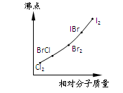 下圖是部分鹵素單質(zhì)和XX’型鹵素互化物的沸點(diǎn)與其相對(duì)分子質(zhì)量的關(guān)系圖。試推測(cè)ICl的沸點(diǎn)所處的最小范圍是![]()