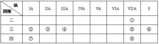 (10分)下圖是元素周期表的一部分,針對(duì)表中的①—⑧八種元素,用元素符號(hào)或化學(xué)式回答相關(guān)問題:![]()