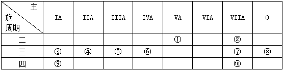 (14分)下表是元素周期表的一部分,針對(duì)表中的①~⑩中元素,用元素符號(hào)或化學(xué)式填空回答以下問題:![]()