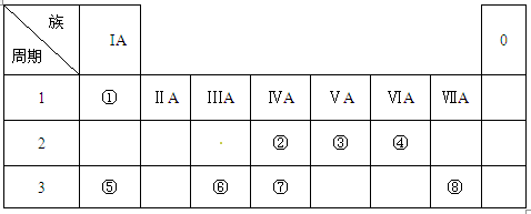 (12分)下表為元素周期表的一部分,請(qǐng)參照元素①-⑧在表中的位置,用化學(xué)用語回答下列問題:![]()