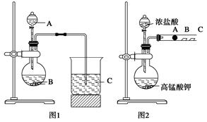 某研究性學(xué)習(xí)小組設(shè)計(jì)了一組實(shí)驗(yàn)來(lái)探究元素周期律。甲同學(xué)根據(jù)元素非金屬性與對(duì)應(yīng)最高價(jià)含氧酸之間的關(guān)系,設(shè)計(jì)了如圖1裝置來(lái)一次性完成N、C、Si三種非金屬元素的非金屬性強(qiáng)弱比較的實(shí)驗(yàn)研究;乙同學(xué)設(shè)計(jì)了如圖2裝置來(lái)驗(yàn)證鹵族元素性質(zhì)的遞變規(guī)律。A、B、C三處分別是沾有NaBr溶液的棉花、濕潤(rùn)的淀粉KI試紙、濕潤(rùn)紅紙。已知常溫下濃鹽酸與高錳酸鉀能反應(yīng)生成氯氣。![]()