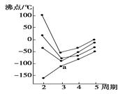 下圖中每條折線表示周期表ⅣA~ⅦA中的某一族元素氫化物的沸點(diǎn)變化。每個(gè)小黑點(diǎn)代表一種氫化物,其中a點(diǎn)代表的是( )![]()