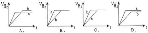 等質(zhì)量的兩份鋅粉a、b分別加入到兩份質(zhì)量相同的過(guò)量的稀硫酸中,同時(shí)向a中加入少量的CuSO4溶液,下列各圖為產(chǎn)生H2的體積V(L)與時(shí)間t(min)的關(guān)系,其中正確的是( )![]()