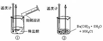 通過實(shí)驗(yàn)測(cè)出,反應(yīng)前后①燒杯中的溫度升高,②燒杯中的溫度降低。由此判斷NaOH溶液跟鹽酸的反應(yīng)是 (填 “吸熱”或“放熱”)反應(yīng),Ba(OH)2· 8H2O跟NH4Cl的反應(yīng)是 (填“吸熱”或“放熱”)反應(yīng)。反應(yīng)①中反應(yīng)物的總能量 填(“大于”、“小于”或“等于”)生成物的總能量。反應(yīng)②中斷開反應(yīng)物中的化學(xué)鍵所吸收的能量 填(“大于”、“小于”或“等于”)形成生成物中的化學(xué)鍵所放出的能量。