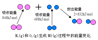 化學(xué)反應(yīng)中的能量變化,是由化學(xué)反應(yīng)中舊化學(xué)鍵斷裂時(shí)吸收的能量與新化學(xué)鍵形成時(shí)放出的能量不同所致。下圖為N2(g)和O2(g)生成NO(g)過程中的能量變化![]()