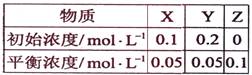 在25℃時,密閉容器中X、Y、Z三種氣體的初始濃度和平衡濃度如下表:![]()