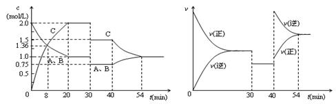 2C(g)。達(dá)到平衡后,只改變反應(yīng)的一個(gè)條件,測得容器中各物質(zhì)的濃度、反應(yīng)速率隨時(shí)間變化如下兩圖所示。下列說法中正確的是( )![]()