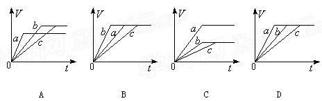 常溫下,在a、b、c三個盛有相同體積、相同濃度的稀H2SO4的燒杯中,分別加入等質(zhì)量的表面積相同的鋅。然后在a中同時加入適量CuSO4溶液,c中加入適量的無水CH3COONa固體。下列各圖中表示其產(chǎn)生氫氣總體積(V)與時間(t)的關(guān)系,其中可能正確的是![]()