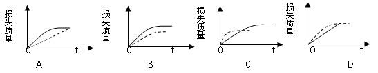 將ag塊狀碳酸鈣跟足量的鹽酸反應(yīng),反應(yīng)物損失的質(zhì)量隨時(shí)間的變化曲線如圖中的實(shí)線所示,在相同條件下,將bg(a>b)粉末狀碳酸鈣與同濃度的鹽酸反應(yīng),則相應(yīng)的曲線如圖中的虛線所示。其中正確的是( )![]()