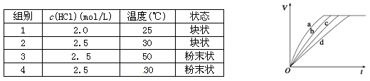 等質(zhì)量的鐵與過量的鹽酸在不同的實驗條件下進(jìn)行反應(yīng),測定在不同時間t產(chǎn)生氫氣體積V的數(shù)據(jù),根據(jù)數(shù)據(jù)繪制得下圖,則曲線a、b、c、d所對應(yīng)的實驗組別可能是![]()