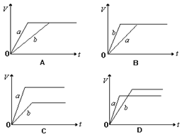將等質(zhì)量的a、b兩份鋅粉裝入試管中,分別加入過量的稀硫酸,同時(shí)向裝a的試管中加入少量CuSO4溶液。下圖表示產(chǎn)生氫氣的體積V與時(shí)間t的關(guān)系,其中正確的是( )![]()