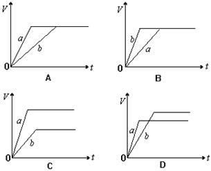 等質(zhì)量的兩份鋅粉A.b,分別加入過量的稀H2SO4,同時(shí)向a中加入少量的CuSO4溶液,下列圖表示產(chǎn)生H2的體積(V)與時(shí)間(t)的關(guān)系,其中正確的是:()![]()