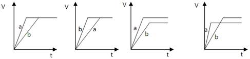 等質(zhì)量的兩份鋅粉a和b,分別加入過量的稀硫酸中,并向a中加入少量CuSO4溶液,下圖表示產(chǎn)生H2的體積(V)與時間(t)的關(guān)系正確的是![]()