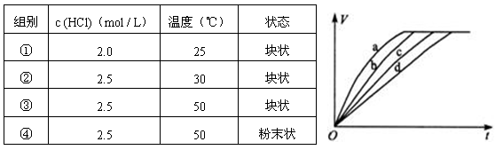 等質(zhì)量的鐵與過量的鹽酸在不同的實驗條件下進行反應,測定在不同時間t產(chǎn)生氫氣體積V的數(shù)據(jù),根據(jù)數(shù)據(jù)繪制得到下圖,則曲線a、b、c、d所對應的實驗組別可能是( 。![]()
