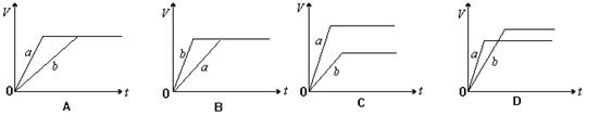 將等質(zhì)量的a.b兩份鋅粉裝入試管中,分別加入過量的稀硫酸,同時向裝a的試管中加入少量CuSO4溶液。下圖表示產(chǎn)生氫氣的體積V與時間t的關系,其中正確的是![]()