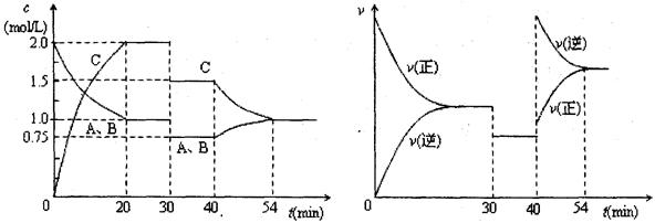 2C(g)。達到平衡后,只改變反應的一個條件,測得容器中各物質(zhì)的濃度、反應速率隨時間變化如下兩圖所示。![]()