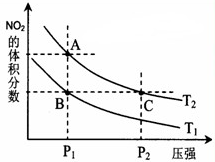 N2O4(g) + Q,在溫度分別為T1、T2時(shí),平衡體系中NO2的體積分?jǐn)?shù)隨壓強(qiáng)變化曲線如右圖所示。![]()
