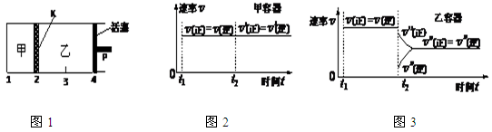 2C(g)+D(g);△H<0。現(xiàn)將1 mol A和2 mol B加入甲容器中,將4 mol C和2 mol D加入乙容器中,此時(shí)控制活塞P,使乙的容積為甲的2倍,t1時(shí)兩容器內(nèi)均達(dá)到平衡狀態(tài)(如圖1所示,隔板K不能移動(dòng))。下列說法正確的是![]()