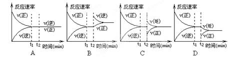 2NH3,在t1時(shí)刻達(dá)到平衡。保持溫度和壓強(qiáng)不變,在t2時(shí)刻,再通入一部分NH3,反應(yīng)速率與時(shí)間的關(guān)系曲線正確的是 ![]()