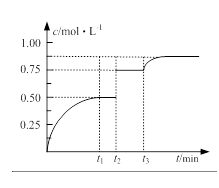 xC(g)+D(s),t1時(shí)達(dá)到平衡。在t2、t3時(shí)刻分別改變反應(yīng)的一個(gè)條件,測(cè)得容器中氣體C的濃度隨時(shí)間變化如圖所示。下列說(shuō)法正確的是![]()