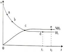 2NH3(g),500℃,30 MPa下n(NH3)和n(H2)隨時間變化的關(guān)系如下圖所示。![]()