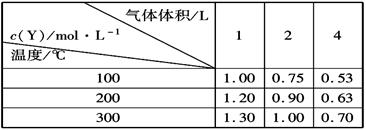 nY(g); ΔH=QkJ/mol。反應(yīng)達(dá)到平衡時(shí),Y的物質(zhì)的量濃度與溫度、氣體體積的關(guān)系如下表所示:![]()