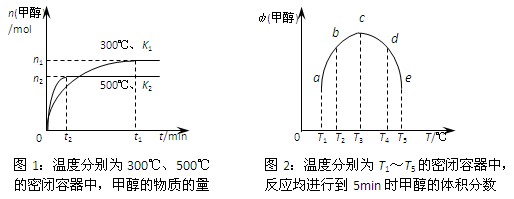 CH3OH(g)。在容積均為1L的a、b、c、d、e五個密閉容器中分別充入等量的1mol CO和2mol H2混合氣體,控溫。實驗測得相關數(shù)據(jù)如下圖1和圖2。![]()