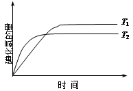 2HI(g),在溫度T1和T2時,產物的量與反應時間的關系如下圖所示.符合圖示的正確判斷是![]()