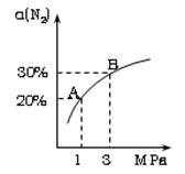 N2的平衡轉(zhuǎn)化率(α~%)與體系總壓強(qiáng)(P)的關(guān)系如下圖所示。下列說(shuō)法正確的是:![]()