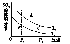 2NO2(g) ΔH=+57 kJ·mol-1,在溫度為T1、T2時,平衡體系中NO2的體積分數(shù)隨壓強變化曲線如圖所示。下列說法正確的是( )![]()