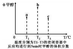 CH3OH(g),F(xiàn)在容積均為1L的a、b、c三個密閉容器中分別充入1mol CO和2mol H2的混合氣體,控制在不同溫度下進行反應,5min時測得相關數(shù)據(jù)的關系如圖所示。下列說法正確的是![]()