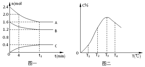在10L密閉容器中,A、B、C三種氣態(tài)物質(zhì)構(gòu)成了可逆反應(yīng)的體系;當(dāng)在某一溫度時(shí),A、B、C物質(zhì)的量與時(shí)間的關(guān)系如圖一,C的百分含量與溫度的關(guān)系如圖二。